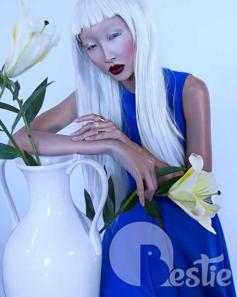 | Tính chất high fashion được Thanh Khoa đề cao trong từng shoot hình. Bên cạnh dáng vẻ mạnh mẽ, quái dị, có lúc "ma nữ tóc bạc" cũng dịu dàng, thanh nhã đến bất ngờ. Đầm xoè trắng, hoa tai tua rua cùng giày mũi nhọn da màu xanh dương gợi lên cảm giác yên bình, thanh tao. |