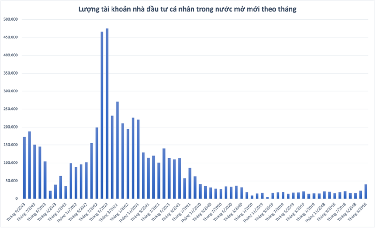 Trong đó, nhà đầu tư cá nhân mở mới 172.605 tài khoản chứng khoán, các tổ chức mở mới 90 tài khoản. Như vậy, tính đến cuối tháng 9, tổng số tài khoản nhà đầu tư cá nhân trong nước đã vượt mức 7,76 triệu tài khoản, tương đương khoảng hơn 8% dân số.