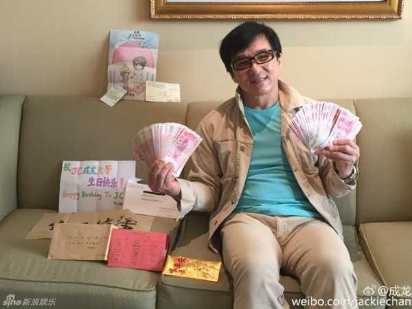 Trong những tấm ảnh, Thành Long vui vẻ với những món quà đầy ý nghĩa về cả tinh thần và vật chất. Nhiều người hâm mộ tặng anh tiền thay vì hiện vật, thế nên xếp tiền mệnh giá 100 NDT cũng được trải kín ghế sofa. Thành Long không giấu sự tự hào khi luôn có vị trí vững chắc trong lòng người hâm mộ suốt những năm qua.