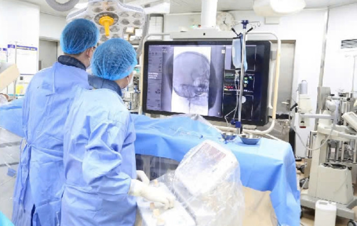 Bác sĩ can thiệp lấy huyết khối mạch não cho người bệnh. (Ảnh: BVCC)