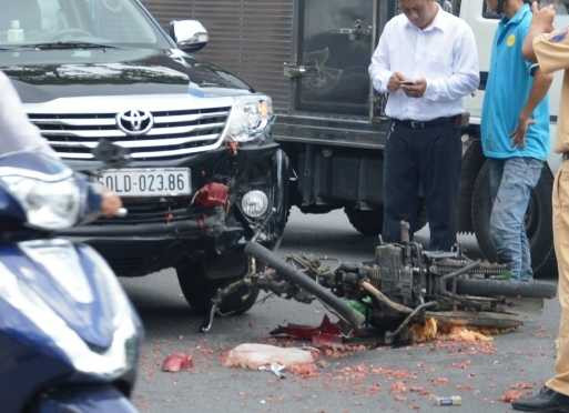 (VTC News) - Nam thanh niên điều khiển chiếc xe máy chở thịt heo chạy tốc độ cao tông thẳng vào xe Fortuner 7 chỗ rồi vứt xe trốn khỏi hiện trường.
