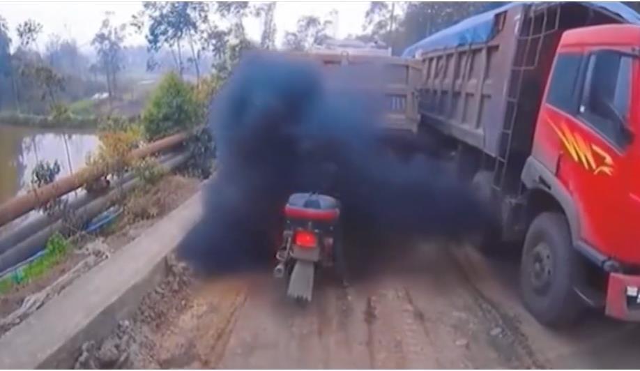 Thanh niên đen đủi, hứng trọn làn khói đen kịt của chiếc xe tải đang nổ máy lên dốc.