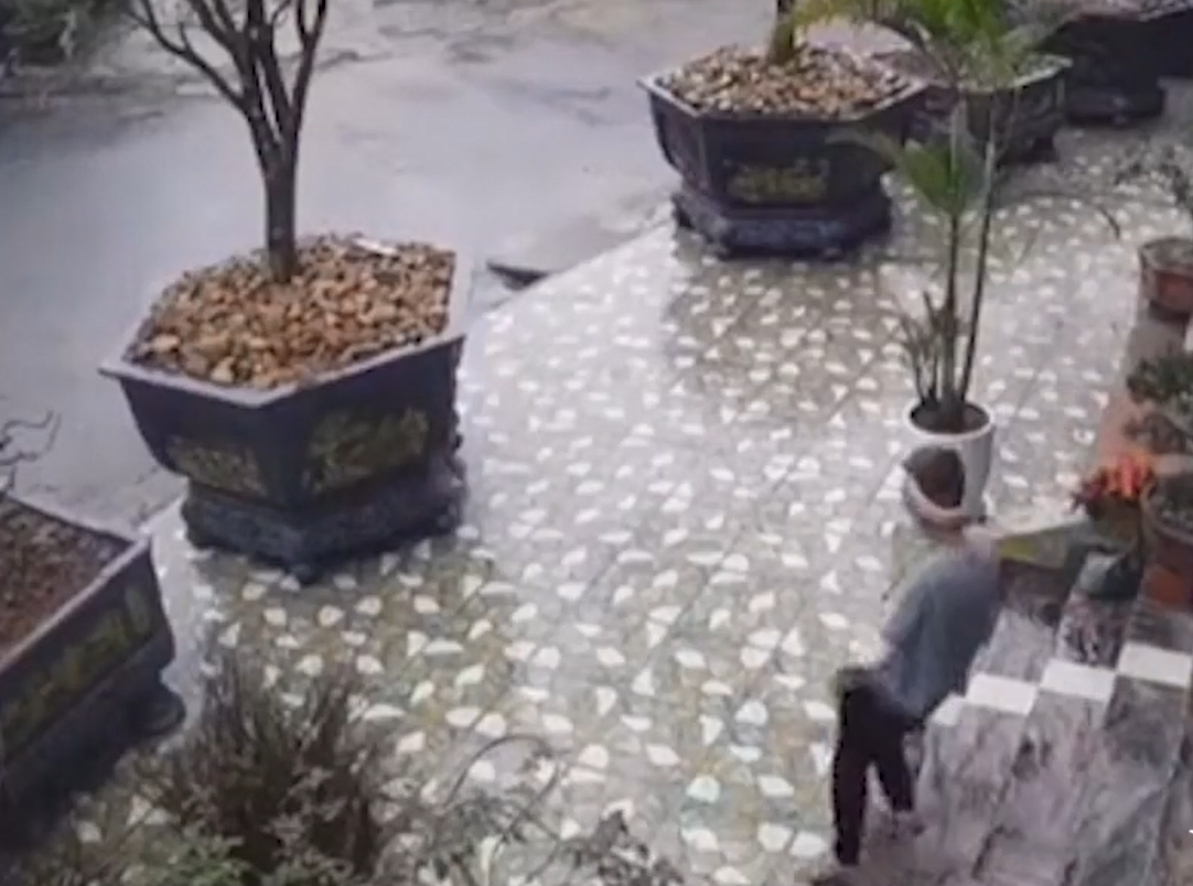 Biết trời mưa nền gạch trơn trượt, chàng trai bước xuống bậc thang rất cẩn thận nhưng "người tính không bằng trời tính".