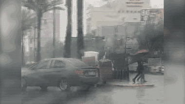 Thanh niên dùng 'bộ giáp' che mưa băng qua đường