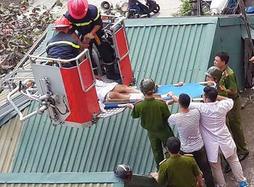 | Lực lượng chức năng tiếp cận, băng bó vết thương và đưa thanh niên 'ngáo đá' xuống đất, chuyển đến Bệnh viện cấp cứu |