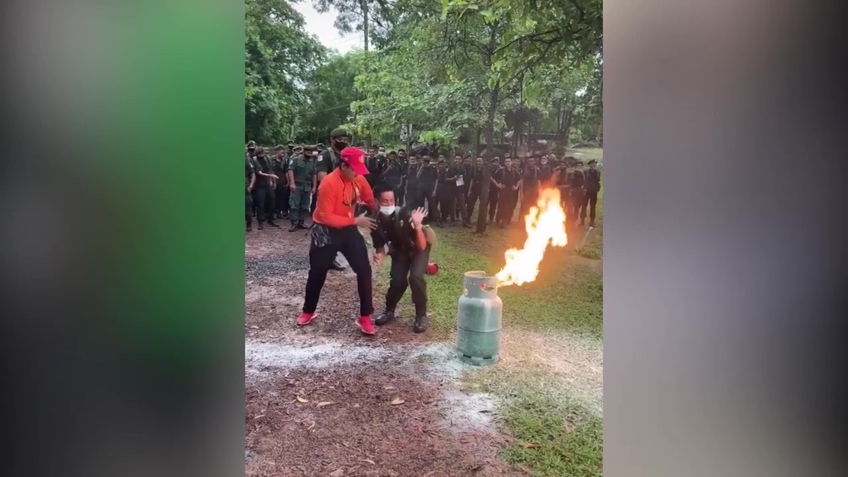 Có người hướng dẫn đứng sát bên để trấn an nhưng chàng trai nhát gan vẫn rất vất vả mới dập tắt được bình gas đang cháy.