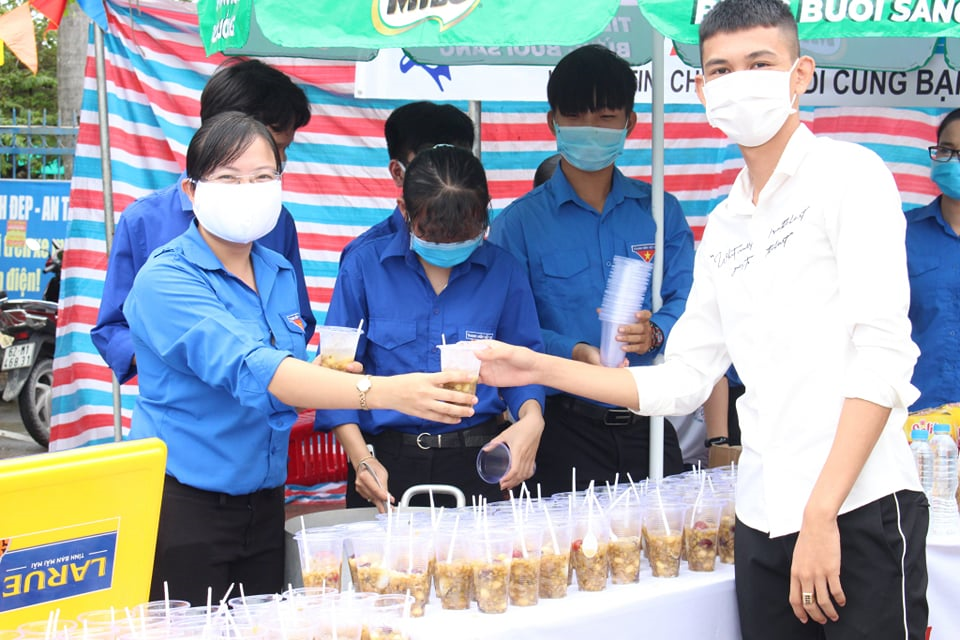 Ngày 10/8, đội thanh niên tình nguyện tại điểm thi trường THPT Đông Thạnh (huyện Cần Giuộc, tỉnh Long An) phát hàng trăm suất “chè hy vọng” tới tay từng sĩ tử trước khi các em làm bài thi tiếng Anh – môn thi cuối cùng trong kỳ thi tốt nghiệp THPT 2020. (Ảnh: Huỳnh Trung Hiếu)