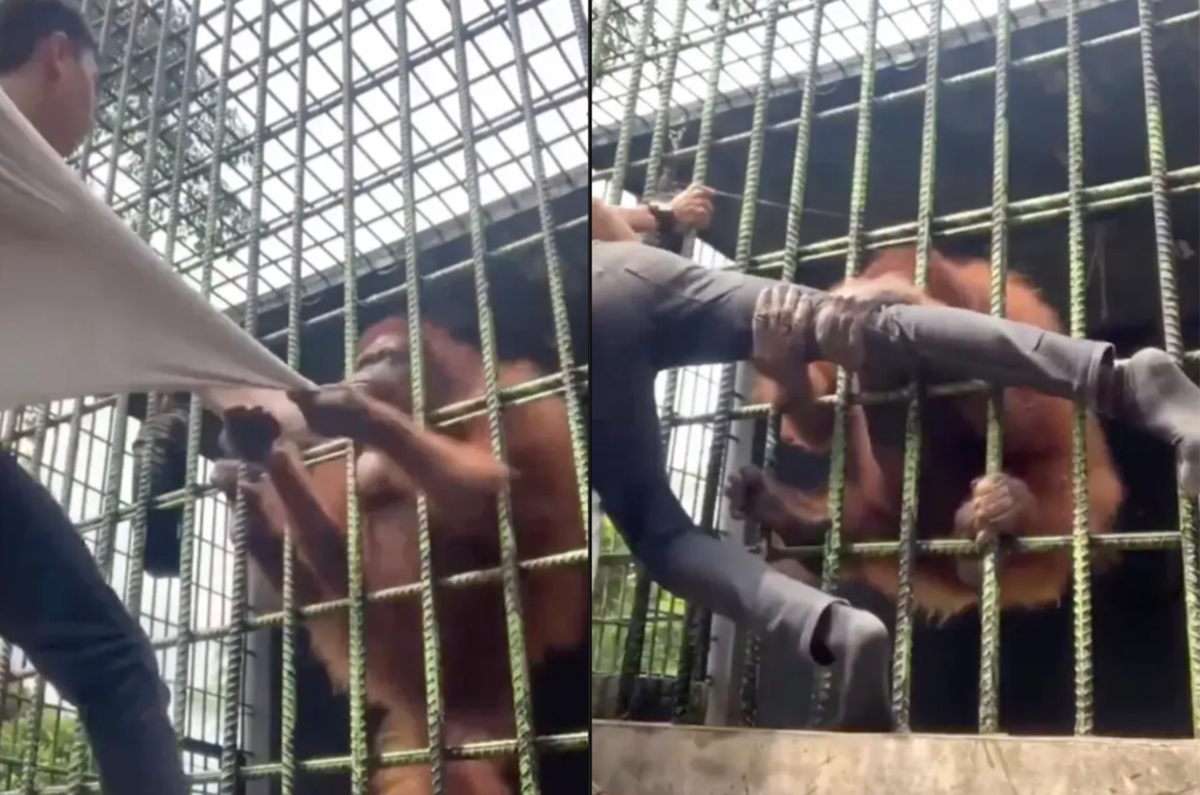 Đoạn video đang được lan truyền trên mạng xã hội cho thấy cảnh tượng thót tim khi một chàng trai đang bị tấn công bởi con đười ươi trong lồng. Được biết, sự việc xảy ra tại vườn thú Kasang Kulim ở Indonesia. Hasanal Arifin, thanh niên 19 tuổi trong video được cho là đã trêu chọc con đười ươi khiến nó nổi giận và có hành động đáp trả.