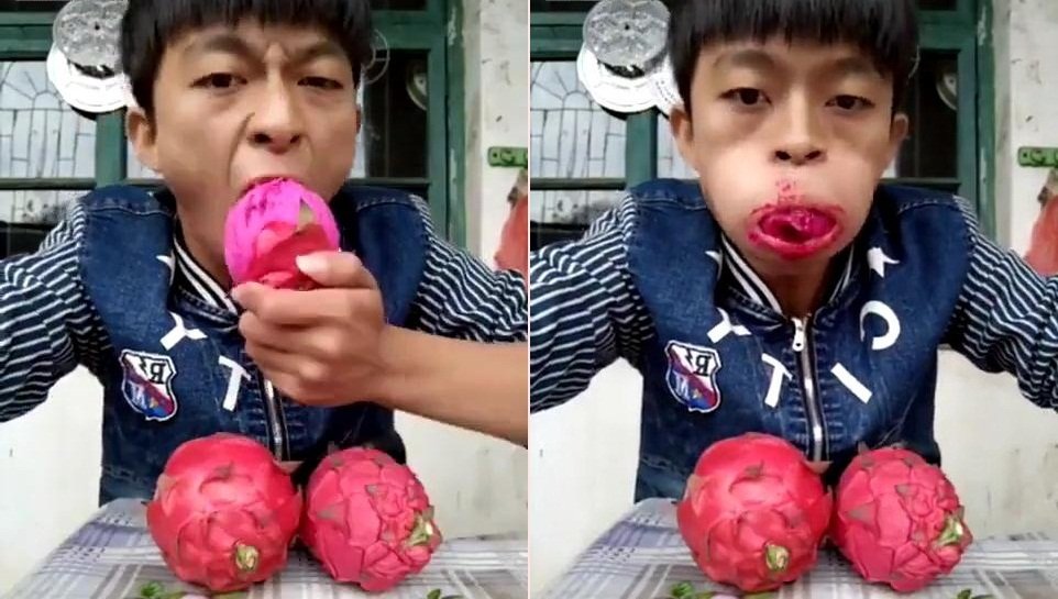 25/10/2017 11:46:00 +07:00Nam thanh niên Trung Quốc hướng dẫn ăn thanh long siêu tốc bằng cách cho nguyên quả vào miệng, nhai nhồm nhoàm khiến cộng đồng mạng choáng váng.