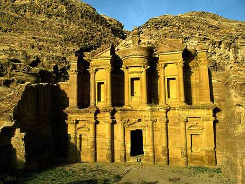 | Hình ảnh một người đang đứng trước cửa của tu viện bên trong thành phố cổ Petra đã cho thấy kích thước kỳ vĩ của tòa nhà cổ. Tu viện này được đế chế Nabataeans tạo nên bằng cách chạm khắc vào một ngọn núi đá sa thạch vào khoảng thế kỷ II và được gọi là El-Deir. |