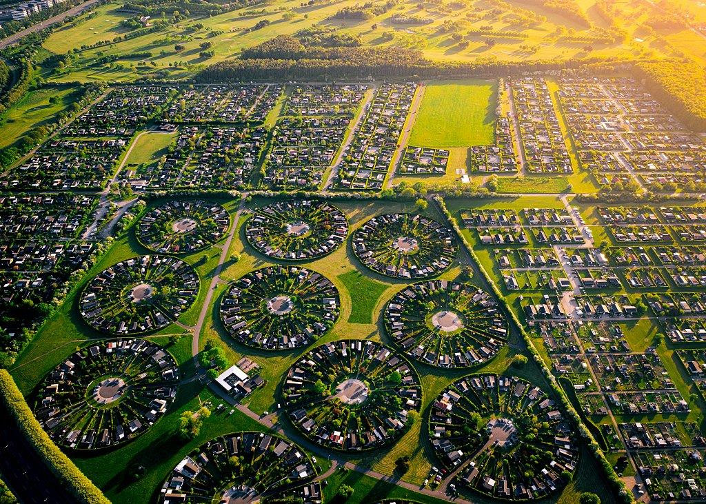 Ở ngoại ô Copenhagen, Đan Mạch có một không gian cộng đồng kỳ lạ và mang phong cách rất riêng - "thành phố vườn" Brondby Haveb. Đây là một tập hợp những ngôi nhà ẩn mình bên trong những khu vườn hình tròn hoàn hảo.