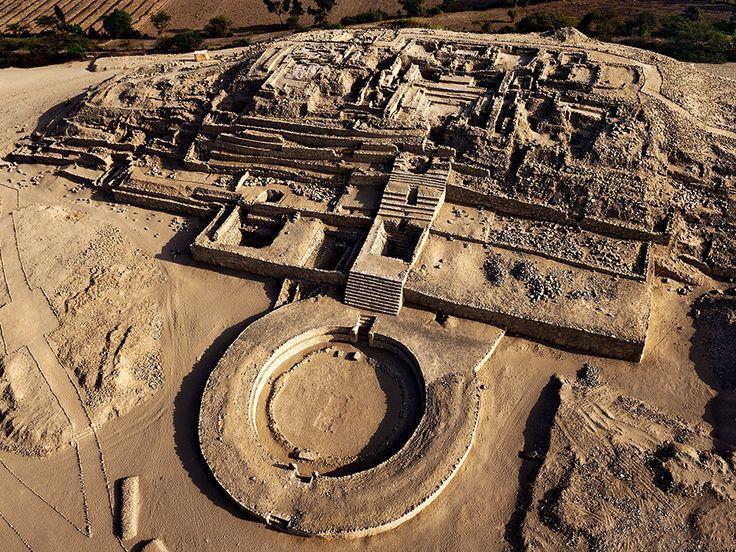 Có sáu kim tự tháp cổ, quảng trường hình tròn trũng và cầu thang khổng lồ, tất cả đều nằm trên một sa mạc lộng gió nhìn ra vùng ngập nước xanh tươi của sông Supe quanh co.