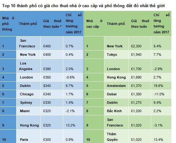 Trong khi đó, bảng xếp hạng các thành phố có giá cho thuê bất động sản cao cấp đắt đỏ nhất lại xướng danh những cái tên khác. New York đứng đầu với mức giá thuê 2.300 bảng Anh/tuần, đắt hơn khoảng 5 lần so với giá bình quân của phân khúc phổ thông và hơn thành phố đứng thứ hai là Tokyo tới 400 bảng Anh/tuần.
