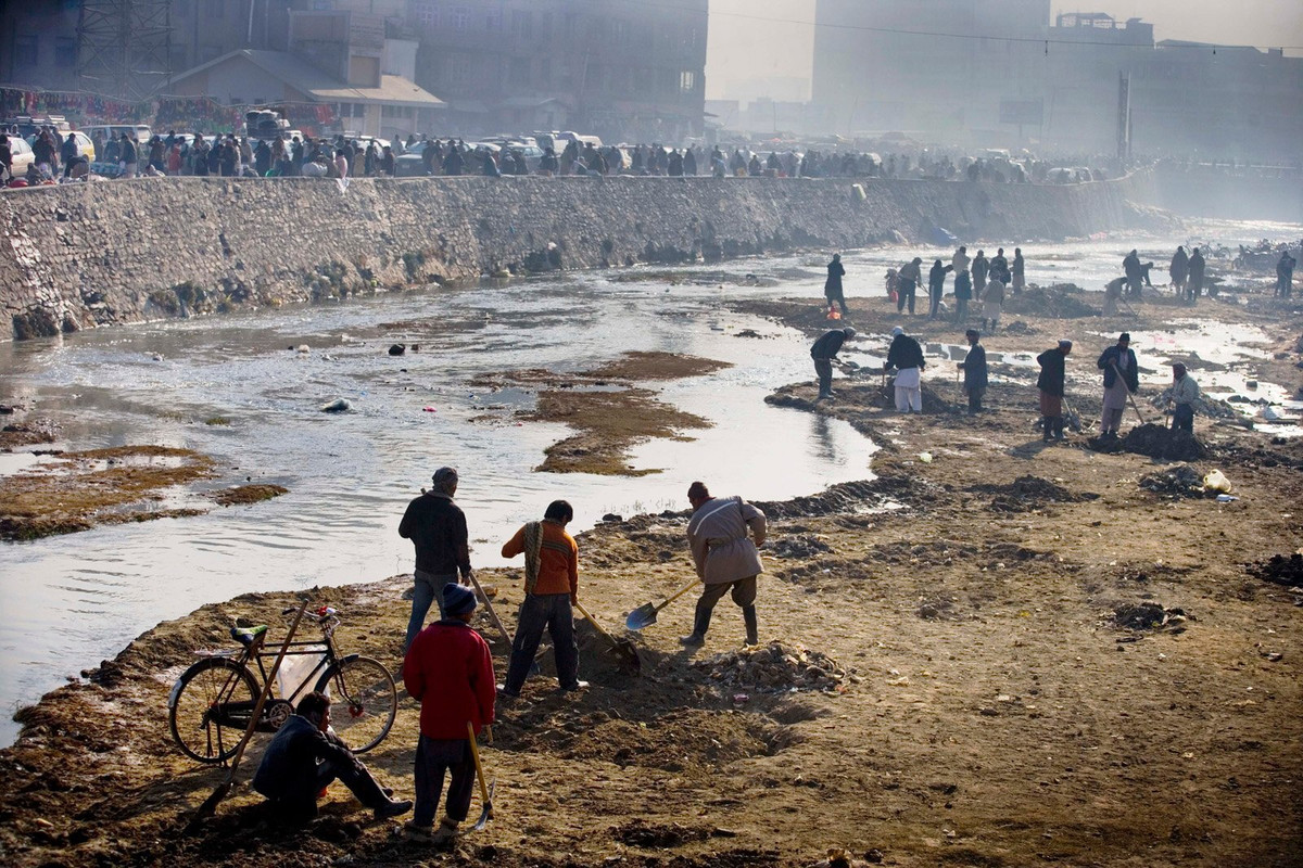 Công nhân đang dọn dẹp sông Kabul. Con sông chính của Kabul đã ngày càng bị ô nhiễm trong vài năm qua và hiện đang được nạo vét.