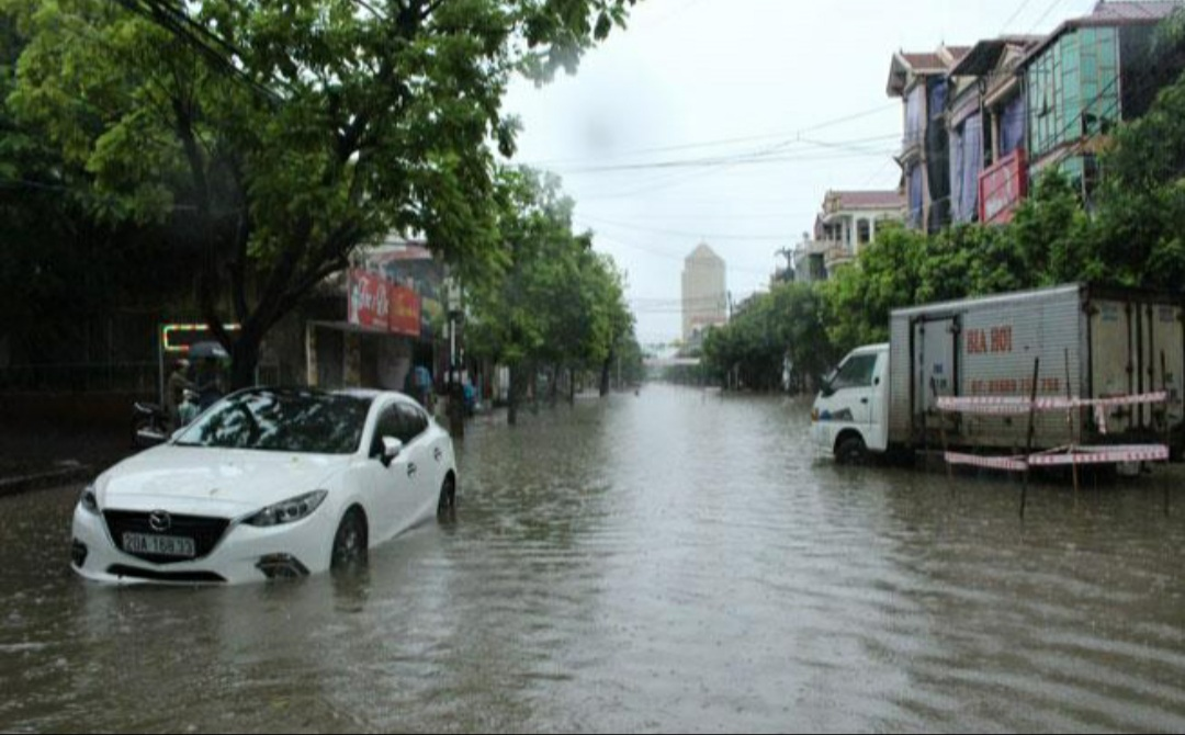 Nhiều tuyến đường ngập sâu khiến các phương tiện đi lại khó khăn. (Ảnh: Báo Thái Nguyên)