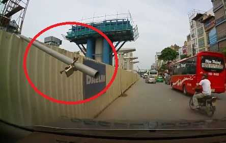 Thanh sắt từ công trường thi công đường sắt trên cao trên đường Hồ Tùng Mậu (Hà Nội) đột ngột nhô ra khiến tài xế ôtô hoảng hồn phanh gấp, suýt chút nữa tai nạn đã xảy ra.