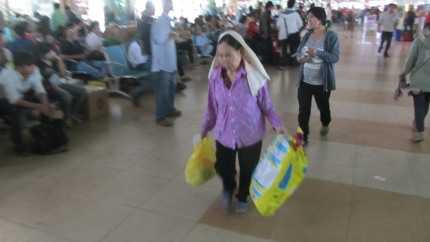 Tay xách, nách mang, hành trang trở về quê nhà để đón tết của người phụ nữ này cực kì đơn giản, gọn nhẹ (ảnh: N.D)
