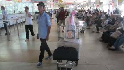 Đến từ huyện Quỳnh Lưu – tỉnh Nghệ An, gặp chúng tôi khi đang chuẩn bị lên xe trở về quê nhà, em Nguyễn Minh Tuấn bộc bạch: “Em theo chân mấy anh chị cùng quê vào TP để kiếm việc làm phụ hồ. Thế nhưng, cuối năm nay, do ảnh hưởng của nền kinh tế, ngành xây dựng lao đao nên chúng em cũng bị ảnh hưởng theo. Việc thì ít, tiền thì hầu như cũng chẳng có mấy, em đành chọn giải pháp mua vé về quê ăn tết sớm. Lí do là càng giáp tết, vé xe càng mắc, mà lại còn đông đúc hành khách nữa.”