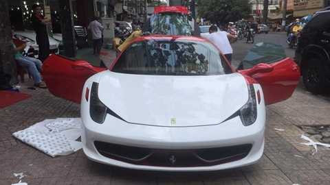 "Siêu ngựa" Ferrari 458 Italia trong màu đỏ tươi từng thuộc sở hữu của thiếu gia Phan Thành nay được đổi chủ và thay sang bộ áo trắng muốt bằng đề-can ngay trên vỉa hè tại Sài Gòn.