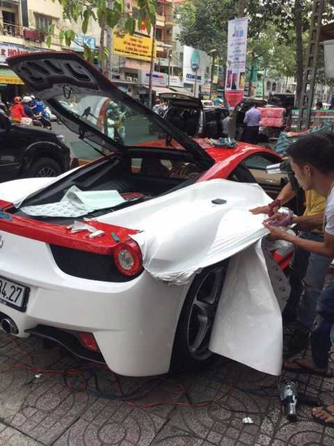 | Siêu xe Ferrari 458 Italia được các thợ Sài thành thay áo ngay trên vỉa hè. |