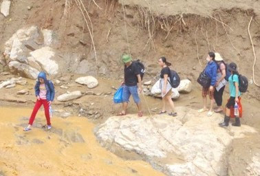 Các giáo viên phải đi ngay dưới con suối vừa mới bị lũ tàn phá.