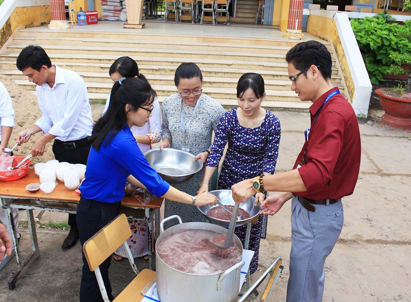 “Đoàn trường tự nấu chè đậu đỏ để mời tất cả học sinh lớp 12. Tuy không lớn lao nhưng đó là tấm lòng của các thầy cô làm công tác đoàn dành tặng, mong các em gặp nhiều may mắn, đỗ đạt trong kỳ thi quan trọng đang tới rất gần”, giáo viên tâm sự. (Ảnh: Huỳnh Trung Hiếu).