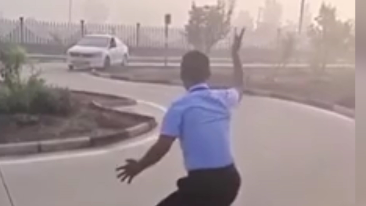 Clip ghi lại cảnh thầy dạy lái đứng phía trước chỉ dẫn như múa võ nhưng học viên vẫn phi xe lên vỉa hè.