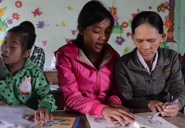 Mỗi buổi học dài hai giờ nhưng bốn thầy cô rất vất vả để truyền đạt kiến thức cho học trò. Thầy Nguyễn Đình Sen (65 tuổi) hết bày học trò đánh vần lại quay sang chỉ em khác làm toán. Không có đầy đủ dụng cụ dạy học nên thầy Sen “sáng tạo” các que tính cộng trừ bằng 10 ngón tay.