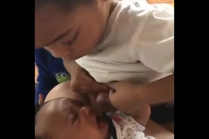 Thấy em gái khóc, bé trai nằng nặc đòi vạch áo cho em bú