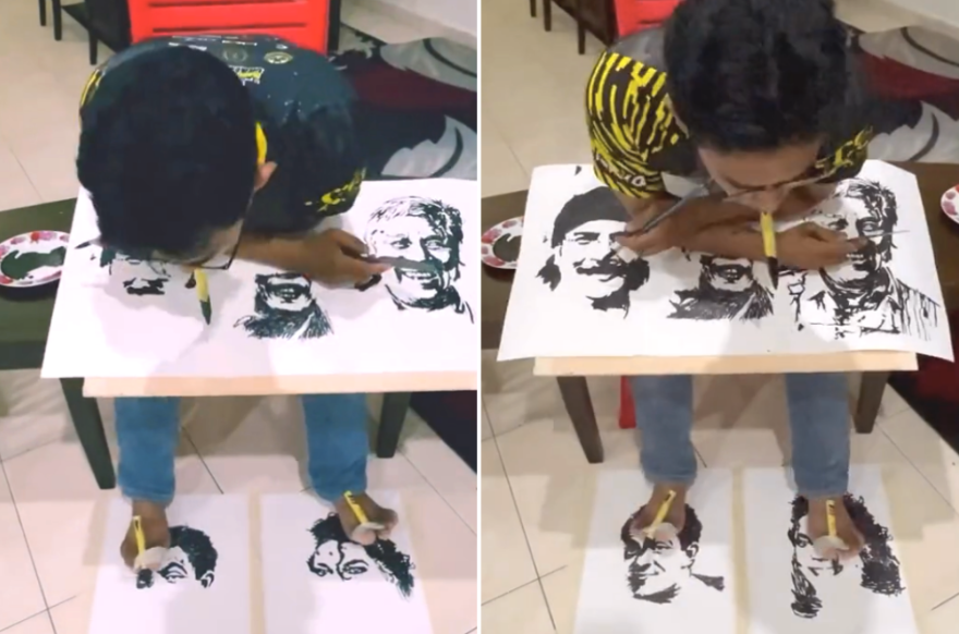 Người đàn ông cùng một lúc vẽ 5 bức chân dung bằng hai chân, hai tay và miệng.