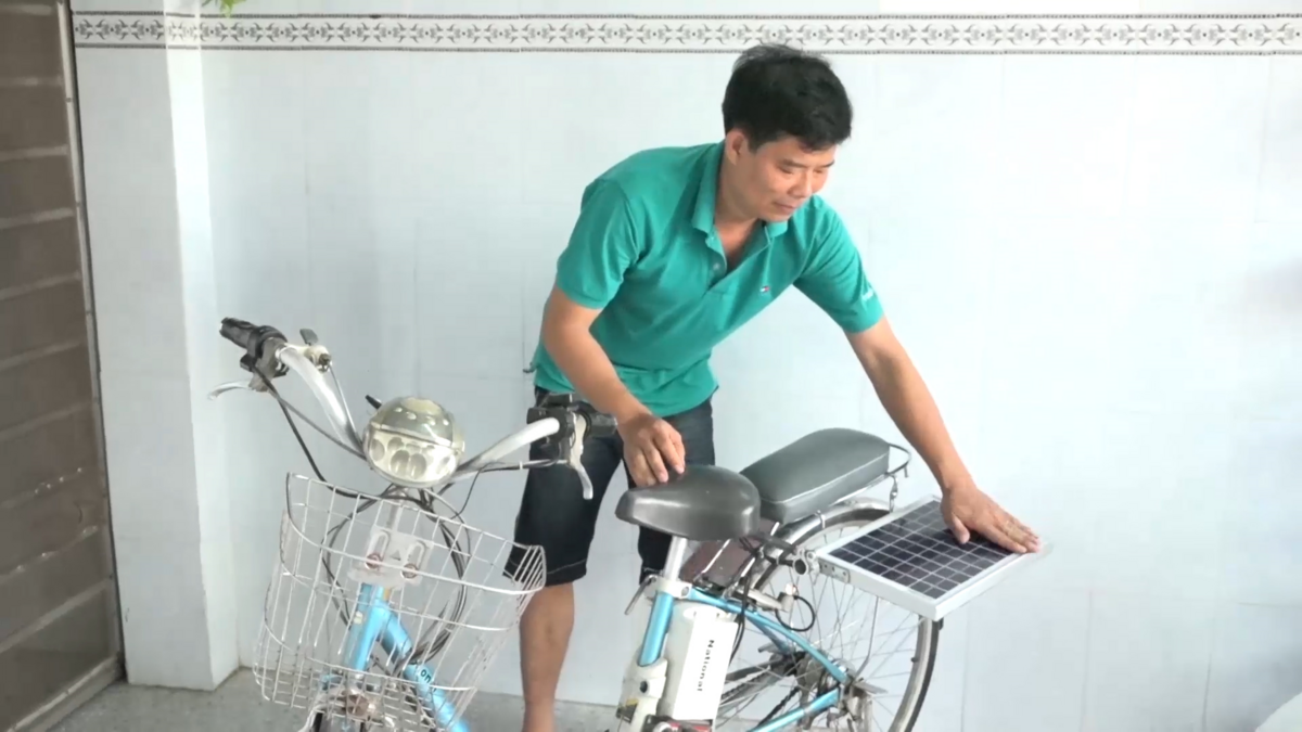 Thầy giáo Nguyễn Ngọc Đấu, trường THPT Nguyễn Khuyến, huyện Thoại Sơn, An Giang đã sử dụng 2 tấm pin năng lương mặt trời cấp nguồn cho ắc quy giúp xe đạp hoạt động.