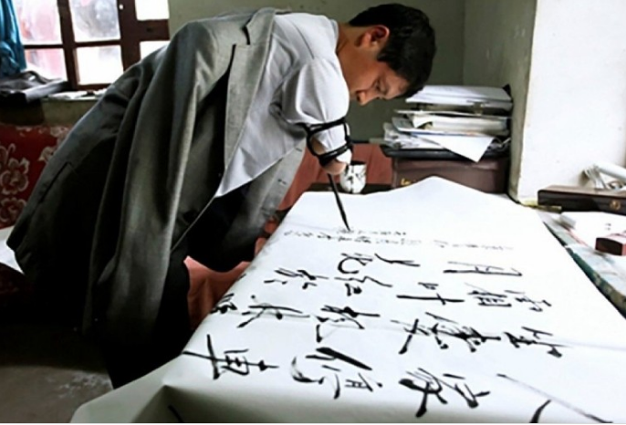 Jiang buộc bút lông vào tay để viết thư pháp. (Ảnh: SCMP)