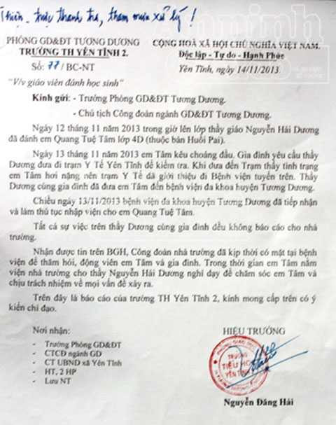 Sau khi sự việc xảy ra, nhà trường đã gọi thầy Nguyễn Hải Dương là người đánh cháu Tâm đến và yêu cầu viết bản tường trình.