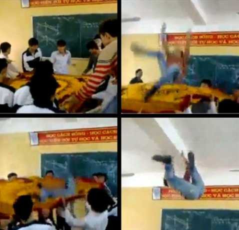 Mới đây, một clip có độ dài chưa đầy 1 phút ghi lại kiểu đùa mới của các học sinh THPT gây xôn xao cộng đồng mạng. Theo đó, có khoảng gần chục học sinh mặc áo đồng phục, cùng nhau giăng tấm chăn rộng để tung một nam sinh khác lên trần nhà.