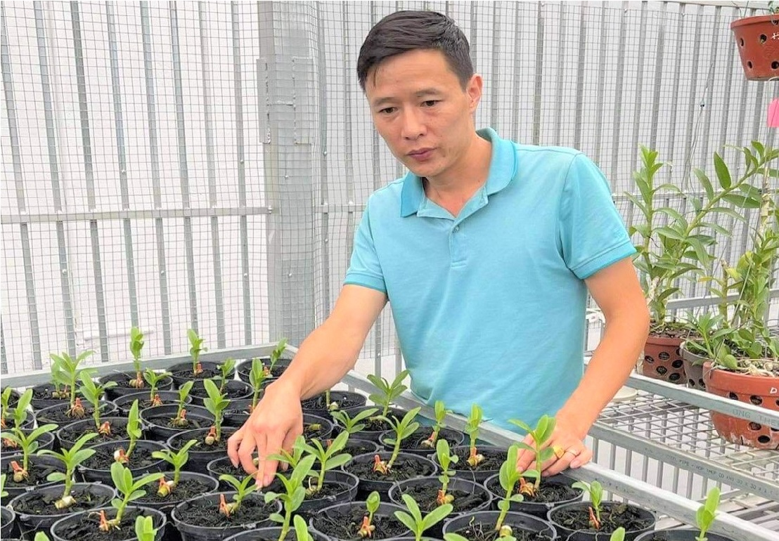 Anh Định tỉ mỉ chăm sóc những cây ươm của vườn lan mình.