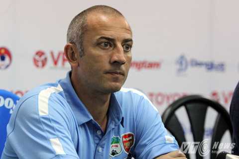 | Thầy Giôm trong phòng họp báo sau trận (Ảnh: Minh Trần) |