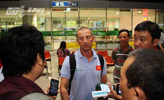 | Thầy Giôm trả lời phỏng vấn tại sân bay Tân Sơn Nhất (Ảnh: Hà Thành) |