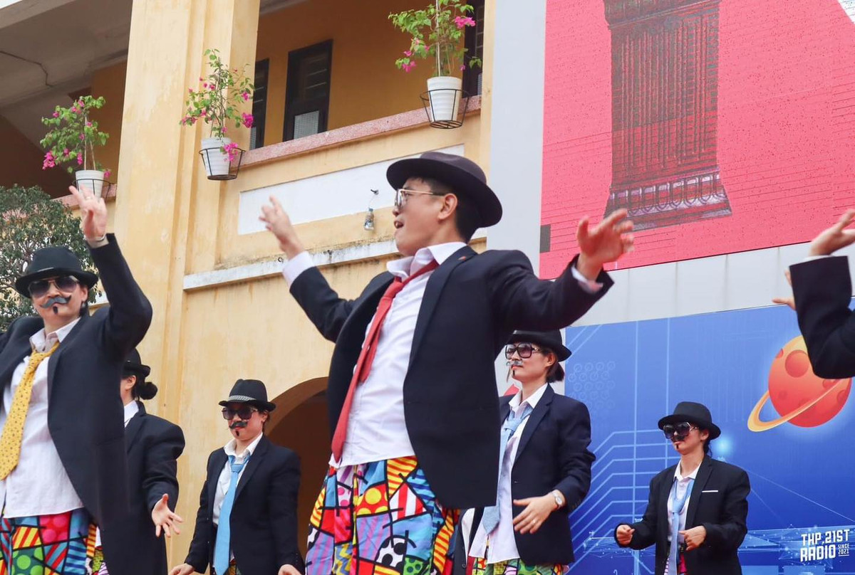 16 thầy, cô giáo diện áo vest, quần đùi nhiều màu sắc, đeo kính đen và gắn râu giả xuất hiện trên sân khấu. Khi bài hát vang lên, các "vũ công" bắt đầu màn biểu diễn đầy sôi động. Phía dưới là tiếng reo hò cổ vũ của học sinh.