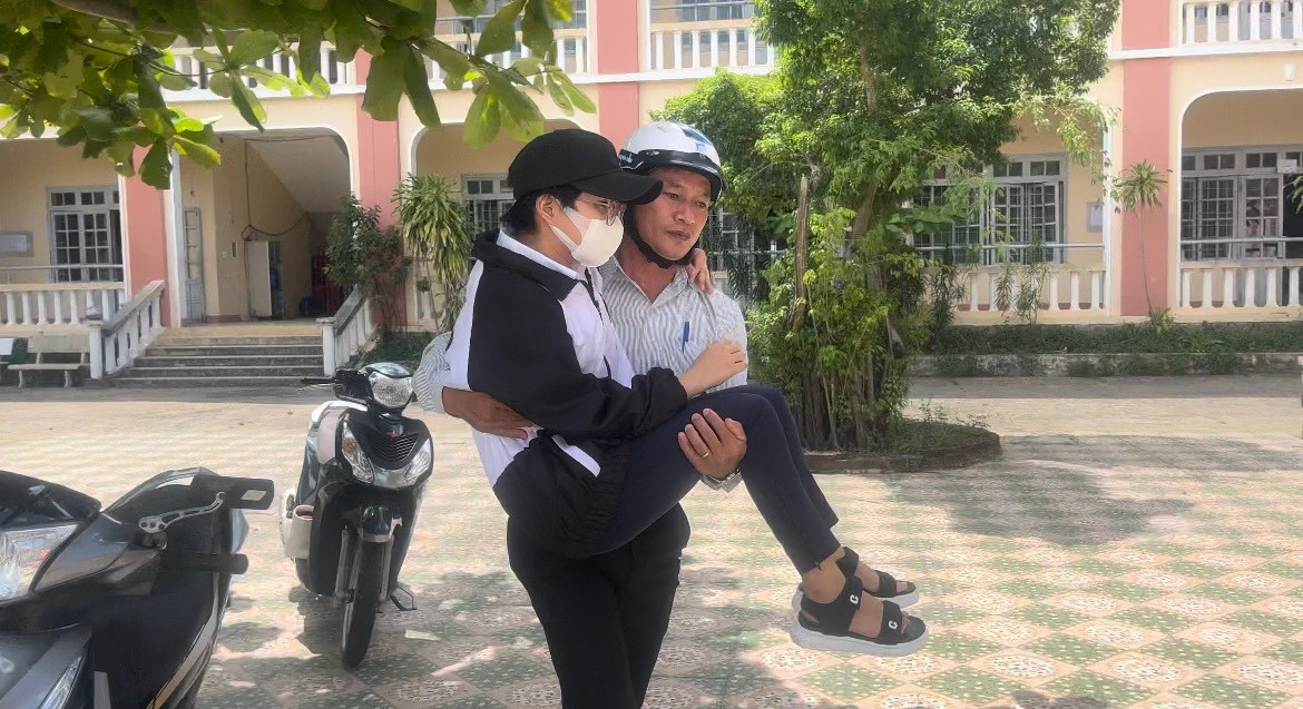 Không những đưa đón đi thi, thầy Toàn còn tận tình chăm sóc sức khỏe cho em. Biết Thi hay mệt, ngồi không được lâu, thầy luôn chủ động bế em vào phòng y tế khi mệt. “Dù kết quả kỳ thi như thế nào thì em Thi đã hoàn thành kỳ thi tốt nghiệp THPT, chiến thắng bản thân mình" - thầy bộc bạch.