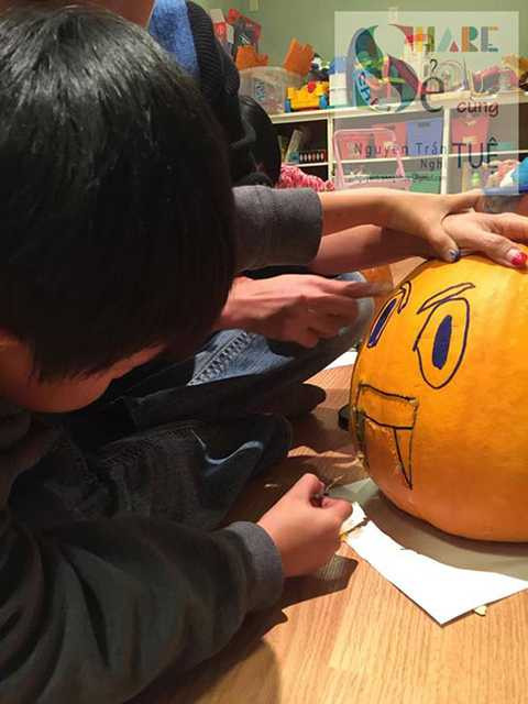Có một bạn nhỏ muốn trang trí quả bí ngô, mẹ đã quyết để bạn tự vẽ lên trái bí ngô và chỉ gợi ý là nên vẽ ở giữa, bởi vì ở trên cần phải khoét cái nắp để cạo ruột bí. Sau một hồi suy nghĩ, bạn quyết định vẽ trái tim như trong hình đầu tiên… và kết quả là cái nắp bị méo qua một bên vì trái tim hơi sát phần cuống. Cứ tưởng bạn ấy sẽ nản, nhưng không hề nhé! Bạn không hề sợ làm sai, ngược lại rất tự tin suy luận, sử dụng các kĩ năng được học để đo đạc lại và điều chỉnh cho phù hợp. Được mẹ động viên và tin tưởng, cộng với sự tự tin và cố gắng hết sức nên kết quả khá là ổn đấy chứ!