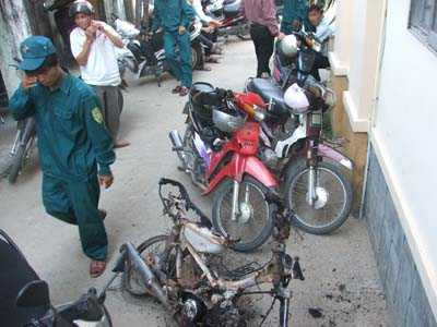Nghĩ vợ sai lại còn la lối, anh Quang tức giận đạp đổ xe rồi mở bình xăng, bật lửa. Chiếc xe máy (loại xe Wave), trị giá trên 15 triệu đồng nhanh chóng bị thiêu rụi.