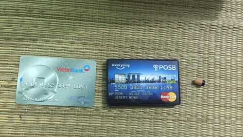 | Thiết bị thu phát, gian lận thi cử (hình bên phải) được ngụy trang dưới dạng thẻ ATM. |
