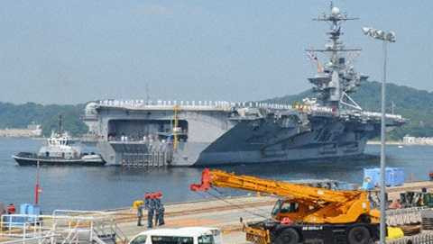 | Tàu sân bay Mỹ George Washington neo tại cảng thuộc căn cứ quân sự Yokosuka, tỉnh Kanagawa, Nhật Bản hồi năm ngoái |