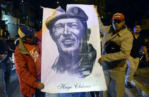 | Những người ủng hộ ông Hugo Chavez cầm bức chân dung ông tập trung bên ngoài bệnh viện quân đội ở Caracas sau khi hay tin ông qua đời |
