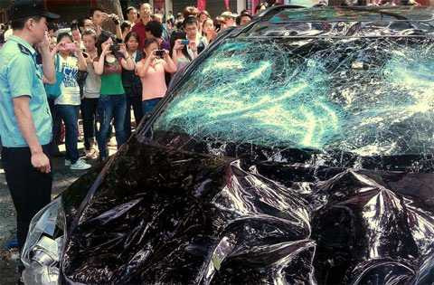 | Một chiếc xe hơi do Nhật sản xuất bị đập nát ở thành phố Tây An, nơi diễn ra những cuộc biểu tình chống Nhật dữ dội nhất hồi tháng trước |