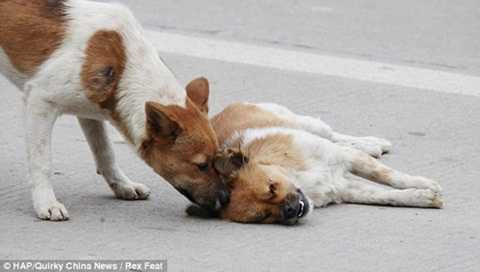Cảnh tượng xúc động xảy ra tại thành phố Chương Châu ở tỉnh Phúc Kiến - Trung Quốc. Một con chó đực đã cố gắng đánh thức bạn tình sau khi nó bị một chiếc xe hơi đâm chết trên đường.