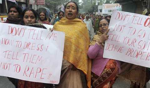 | Phụ nữ Ấn Độ biểu tình sau vụ cưỡng hiếp ở New Delhi, với biểu ngữ "Đừng bảo tôi phải mặc như thế nào! Hãy bảo họ không cưỡng hiếp phụ nữ!" |