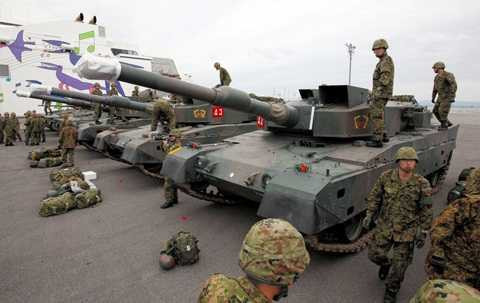 | Các xe tăng và binh sĩ của Nhật tại cảng Oita ở Hokkaido trong cuộc tập trận năm 2011 |