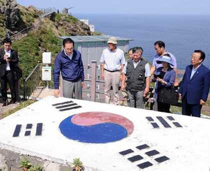 | Tổng thống Hàn Quốc Lee Myung-bak (thứ hai, từ trái sang) trong chuyến thăm nhóm đảo tranh chấp với Nhật Bản do Seoul quản lý |