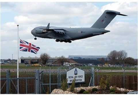 | Chiếc máy bay vận tải C-17 đầu tiên của Không quân Hoàng gia Anh (RAF) đã được huy động để hỗ trợ quân đội Pháp trong ngày hôm qua |